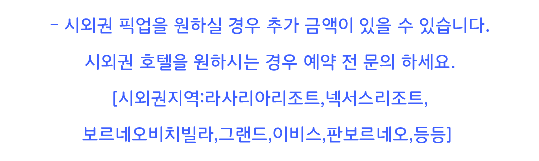 [시외권지역 : 라사리아리조트,넥서스리조트,보르네오비치빌라,그랜드,이비스,판보르네오,등등]
